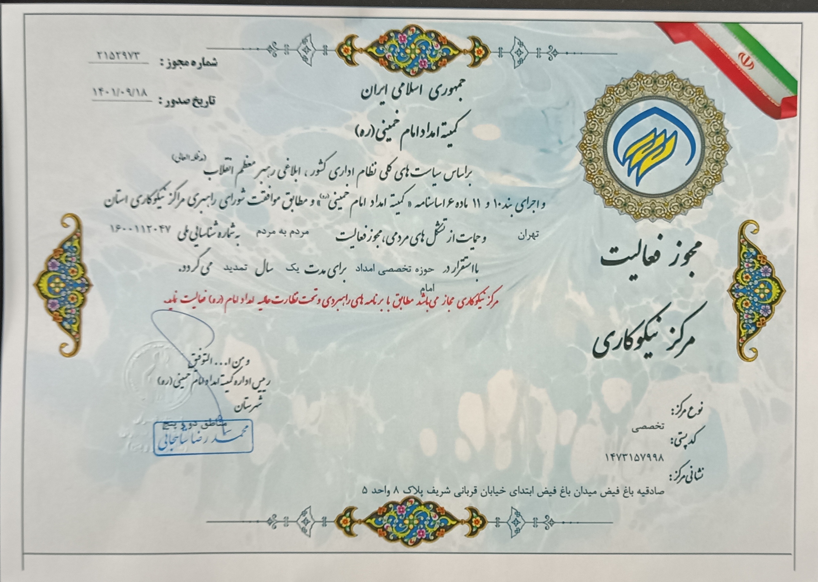 مجوز جدید مرکز نیکو کاری مردم به مردم
