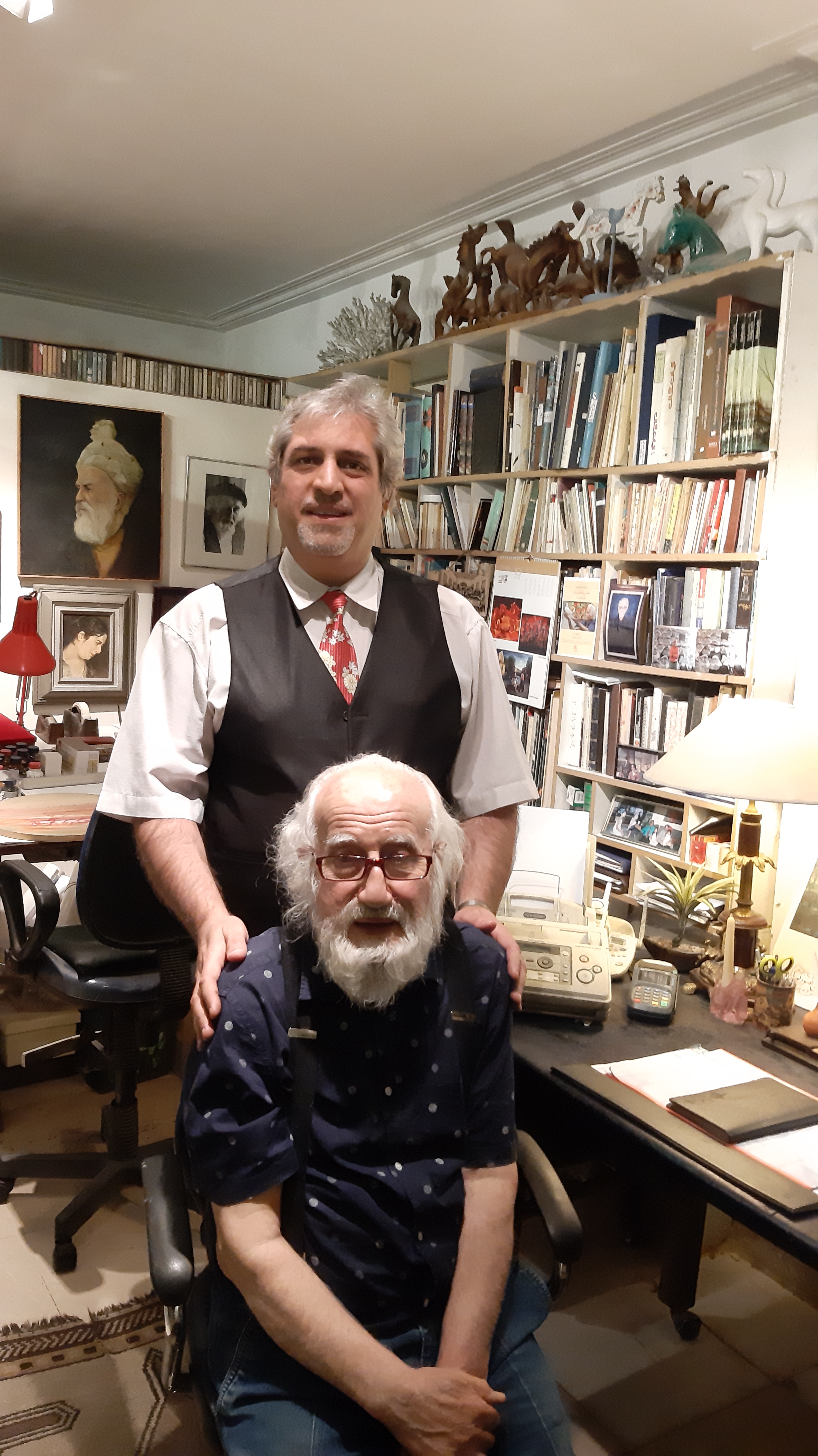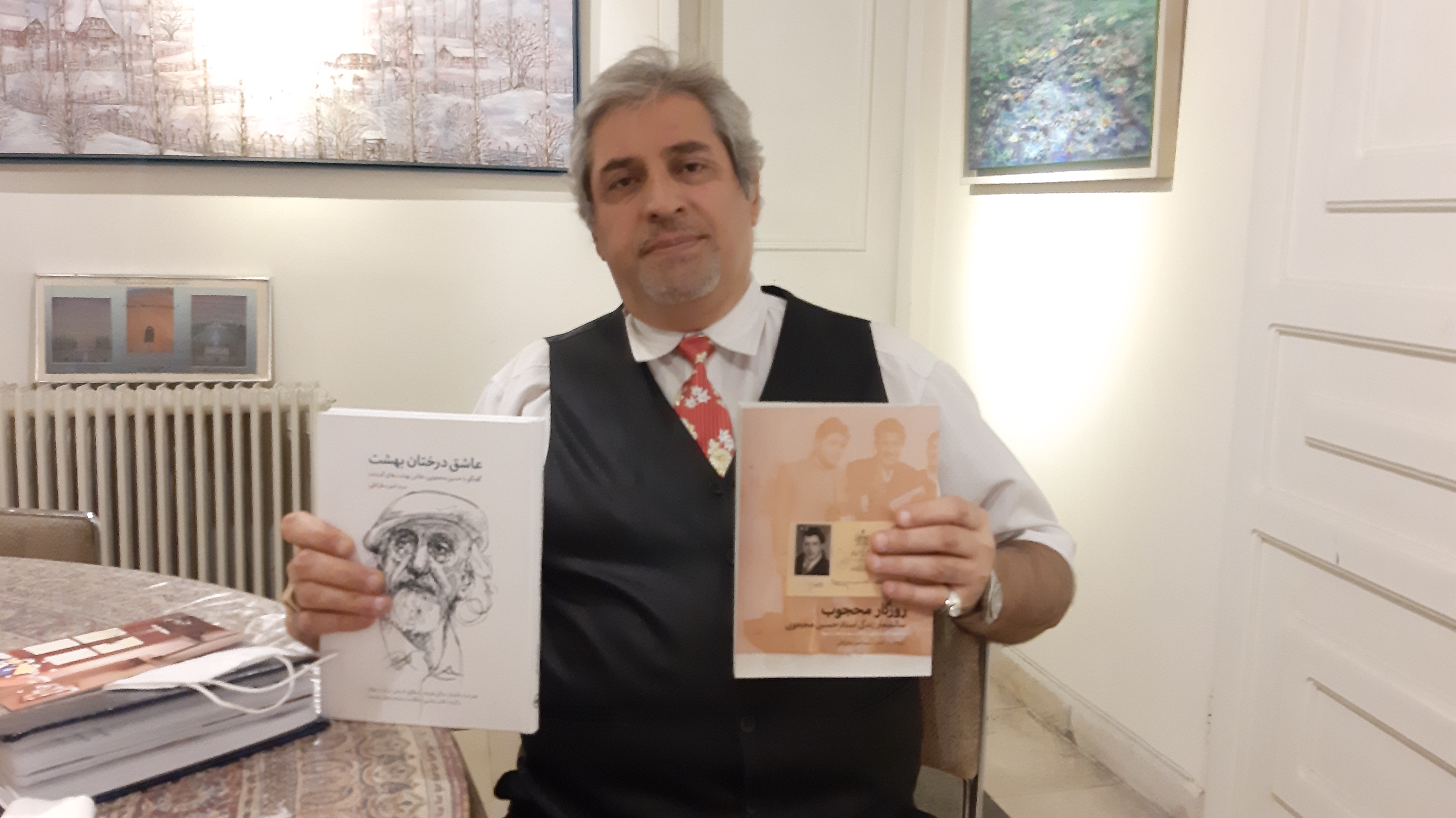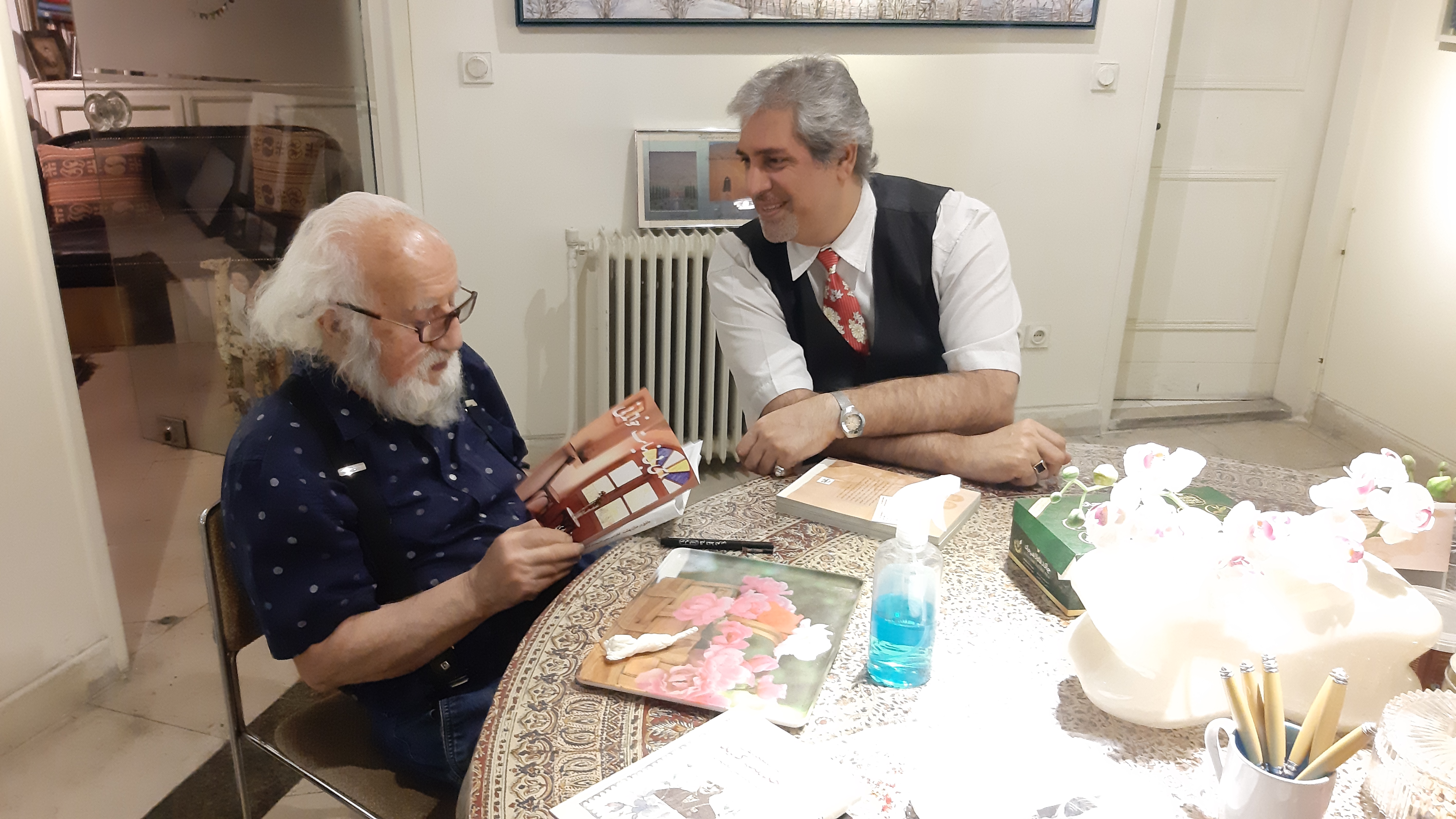 استاد حسین محجبوی در حال نوشتن هدیه برای دکتر جعفر صابری